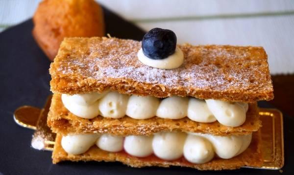 藍莓香草千層派這是我們覺得最棒的一款,先看造型、比例、配色都很完美,裡面的香草卡士達擠花澎澎的好立體啊!千層派很完美,薄、酥、香、脆,最厲害的是中間的卡士達,吃起來超級輕盈細緻的,完全沒有奶醬的膩感。