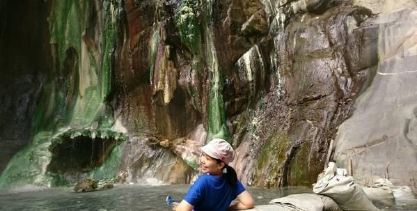 靠著山友的指示,我們一步步的透過看不太出來的攀巖路徑,有些路段還要靠著夥伴的協助才能透過耶 ! 山壁上凝結了碳酸鈣結晶,加上附著在礦物上的翠綠溫泉藻形成的色彩,如同翡翠鑄成的巖壁,果真是名不虛傳的美景呀!