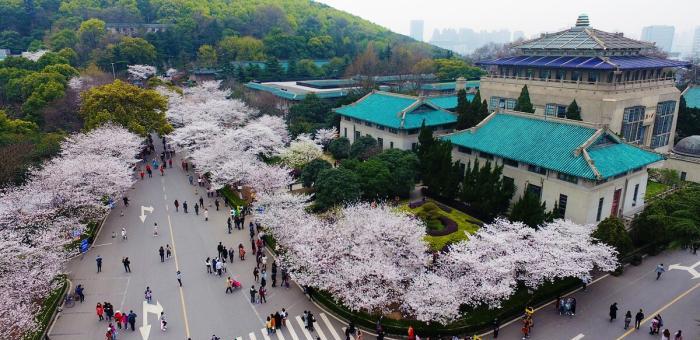 武漢大學的櫻花最吸引人的是滲透著濃濃的書香氣。每年三月中旬開放,到3月下旬達到高峰。1000多株櫻花中,最著名的有日本櫻花,還有山櫻花和紅花高盆櫻花等,各有各的風姿。