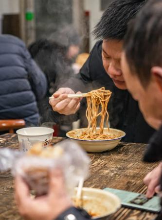 晚高峰臨近,瘦瘦高高的長子才優哉開門煮湯。長子熱乾麵是武漢第一批“溼”派熱乾麵之一,碗麵半勺滷水,一口呲溜往裡吸,絲滑。