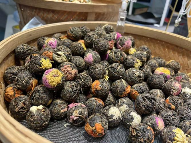 另一邊,雲南花茶的攤主劉芳芳已經是多次到集市的“老朋友”了,這一次,她帶來了新產品——茉莉桂花茶和六味龍珠茶。“六味龍珠茶就像一個個龍珠,裡面包含了茉莉,白菊,黃菊,百合、玫瑰、牡丹等六種口味,是一種養胃的茶。”劉芳芳介紹,現場馬卡龍覆盆子、茉莉桂花茶、夢幻夏威夷則最受熱捧,很多外國人都會在這裡“先嚐後買”,生意火爆。