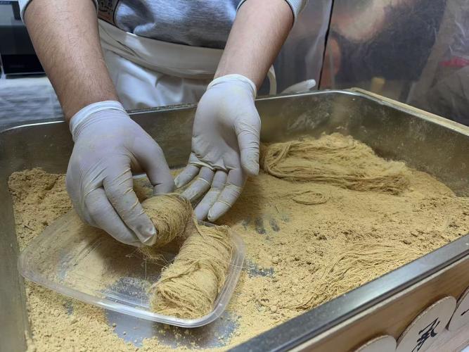 除了“熱”,非遺手工也是一大亮點。“全上海應該只有3個人能做手工龍鬚酥。”手工龍鬚酥攤位上,攤主從保溫爐裡揪出一大塊麥芽糖,拉成環狀,反覆對摺,就像拉麵一樣,不一會兒麥芽糖就變成了須狀,在糯米花生粉裡裹上一遭,龍鬚酥就做好了。小夥子告訴記者,他從陝西來滬創業,已經做了4、5年了,他喜歡在市集裡展現非遺美食的技藝,既能讓更多人走進非遺,購買的消費者也很多,比流水線製造好吃多了。