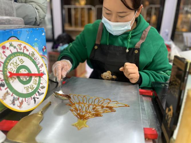 非遺糖畫也是攤位熱門。為了迎接新年,攤主還特地為冬日季推出了限定版產品,以麥芽糖為筆,不一會兒一幅“糖畫”就完成了,攤主告訴記者,賣得最好的除了限定版產品,還有龍、蛇等生肖。