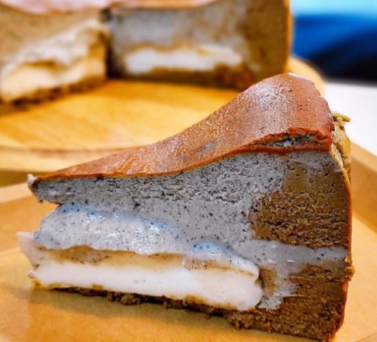 這是烤焙芝士蛋糕,結合了鹹蛋黃流沙層、綿密芋泥層和會牽絲的麻糬夾心,口感豐富到爆炸!