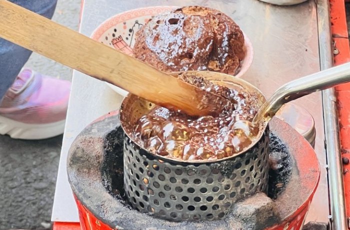 甜點 柴燒椪糖 古法炭火製作,砂糖膨脹成中空脆殼,入口即化 中央市場內無名攤 NT$20 - NT$30/個 看製作過程像魔術!輕飄飄,趣味十足,趁熱吃!